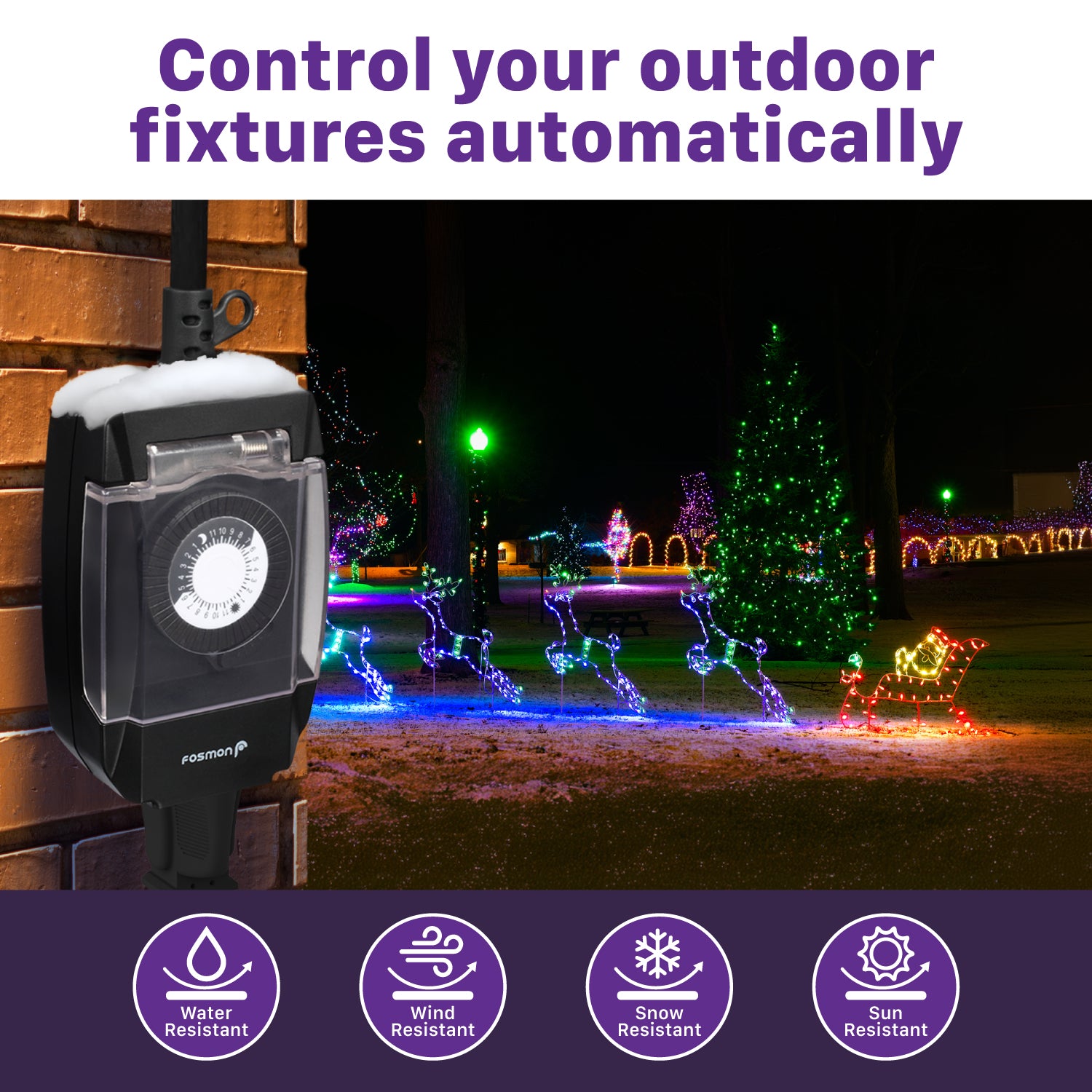 Program Fosmon's 24-hour outdoor light timer to light your outdoors without having to brave the weather. Avoid the inconvenience of plugging and unplugging your outdoor lights and decorations - instead, you can stay inside and let the timer do the work!
