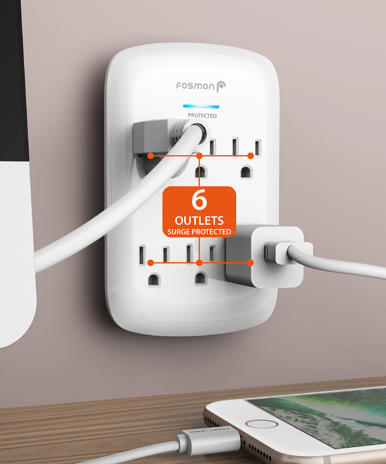 Fosmon's 6 outlet surge protector triples the number of available outlets compared to standard wall outlets and protects electronics from power surges.