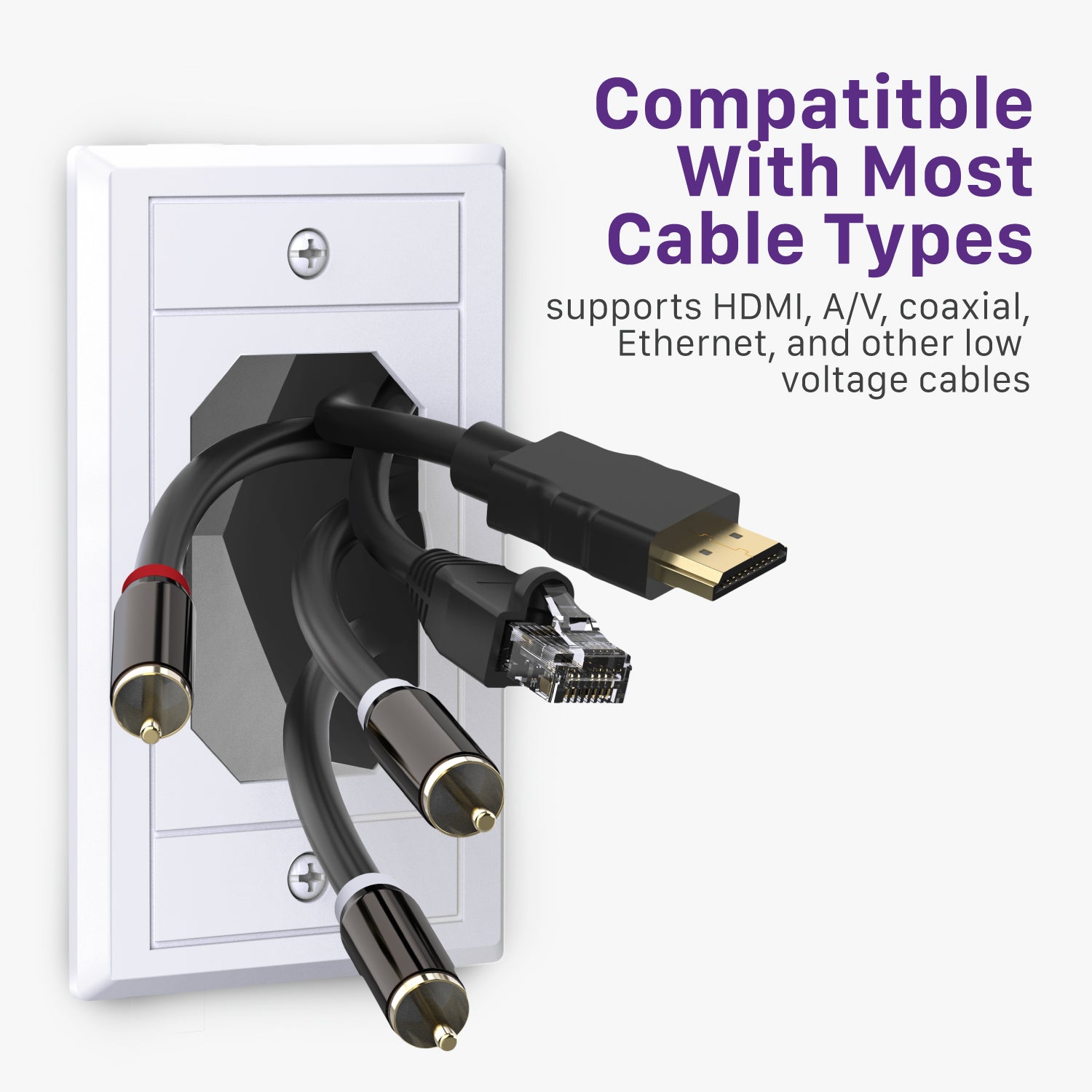 Fosmon's low voltage wall plate is designed specifically for the installation of low-voltage cables and wires in walls. The design accommodates the space needed for speaker wires, coaxial, HDMI and data/communication cables. It runs cables neatly through walls, providing a professional look with a fraction of the cost.