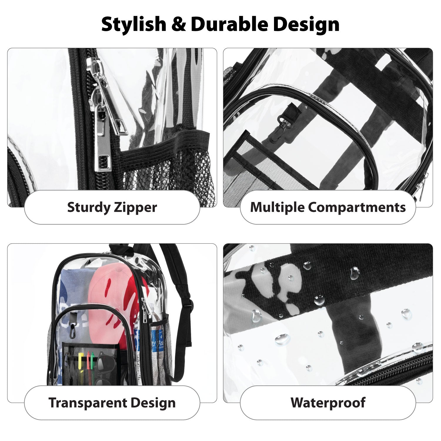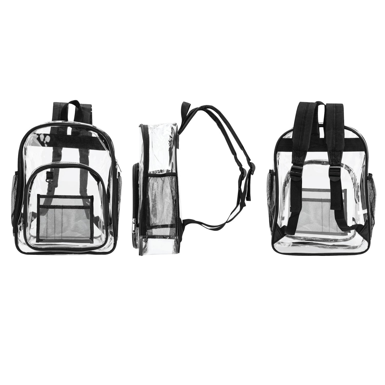 Combining function and fashion, this transparent backpack features sleek black detailing that complements any outfit. Its minimalist, unisex design makes it suitable for both men and women who value style, practicality, and compliance with clear bag policies.