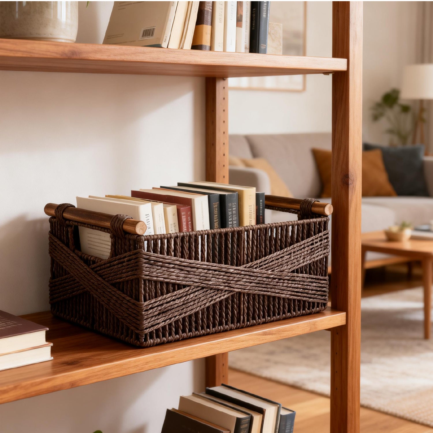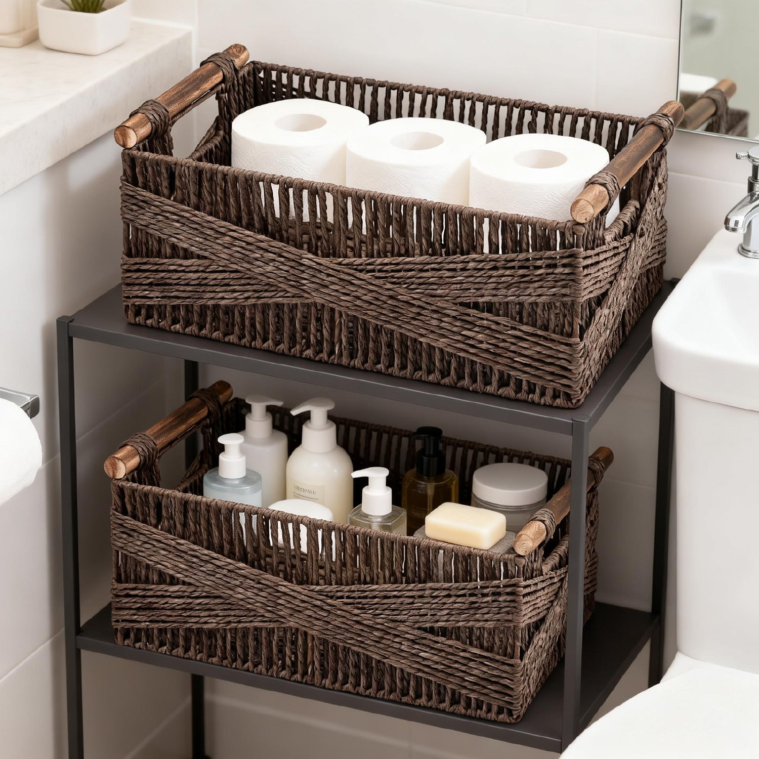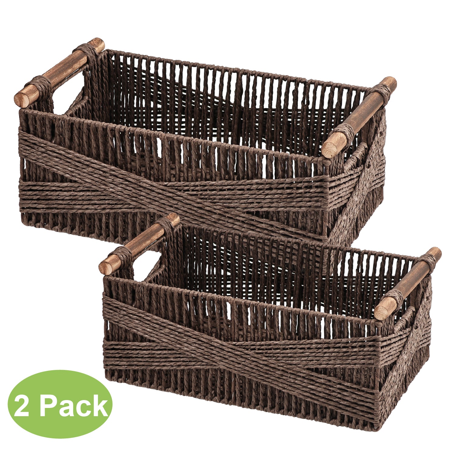 Crafted with a natural woven design, wooden handles, and a dark color, these baskets will complement any part of your home. Perfect for organizing shelves, managing clutter, storing books, magazines, electronics, and more!