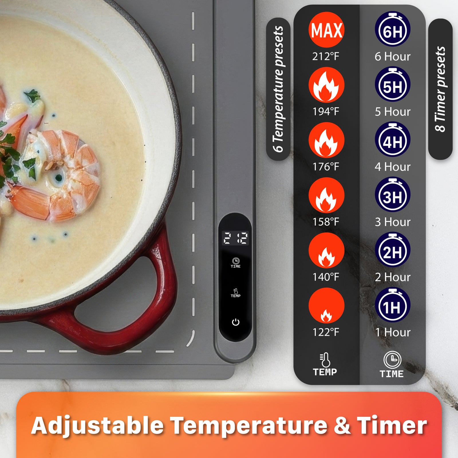 This mat allows full control of how you want to keep your items warm. Set an auto-off timer anywhere from 1-6 hours, or leave it on for extended periods if needed. Temperature increments allow you to adjust from 122°F to 212°F in increments of 18°F/10°C to suit your specific needs.