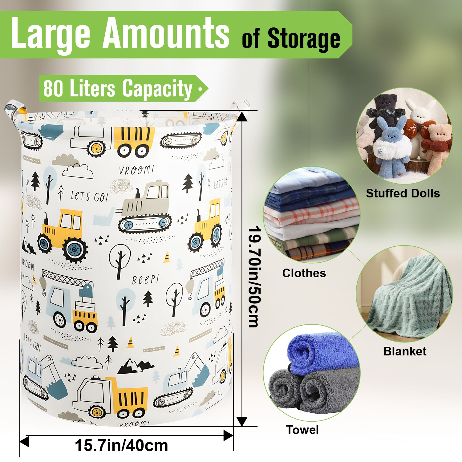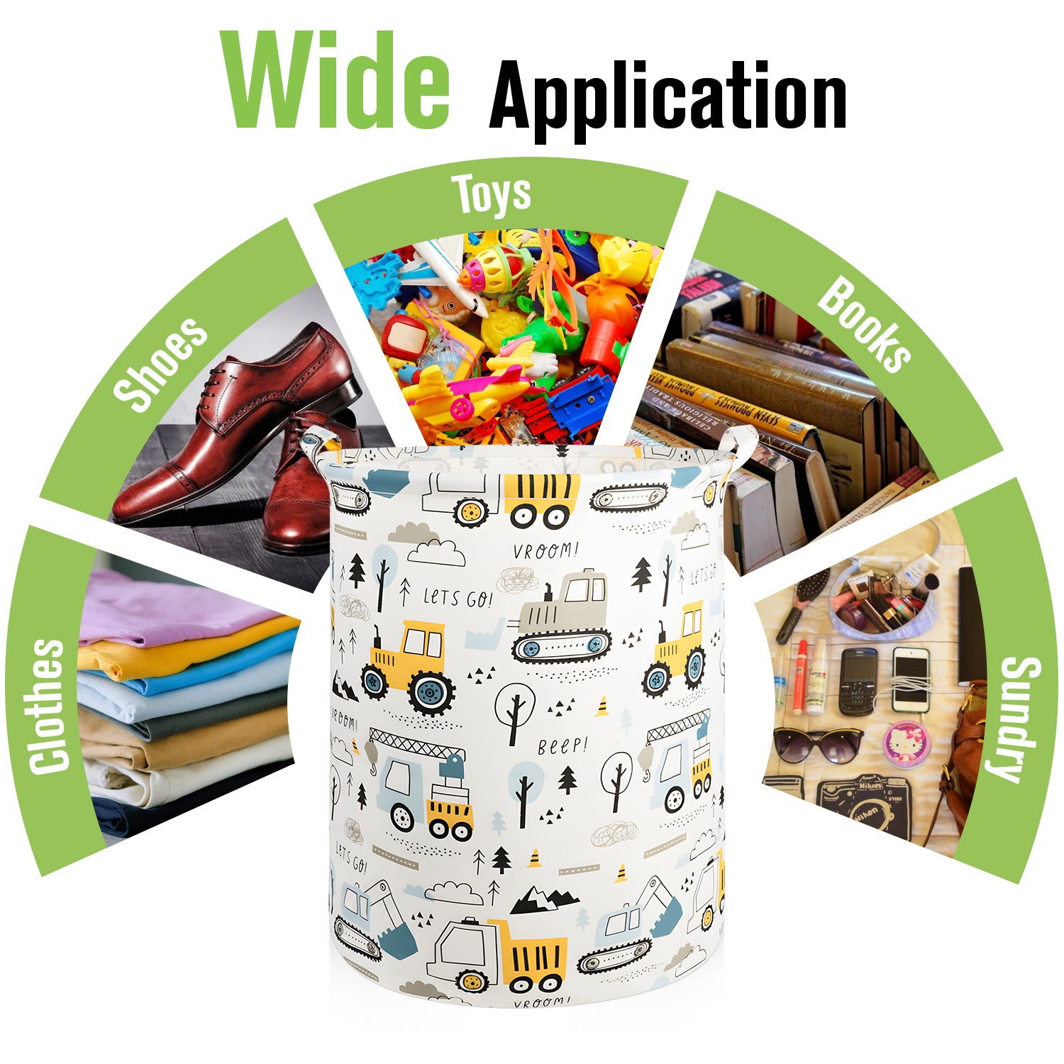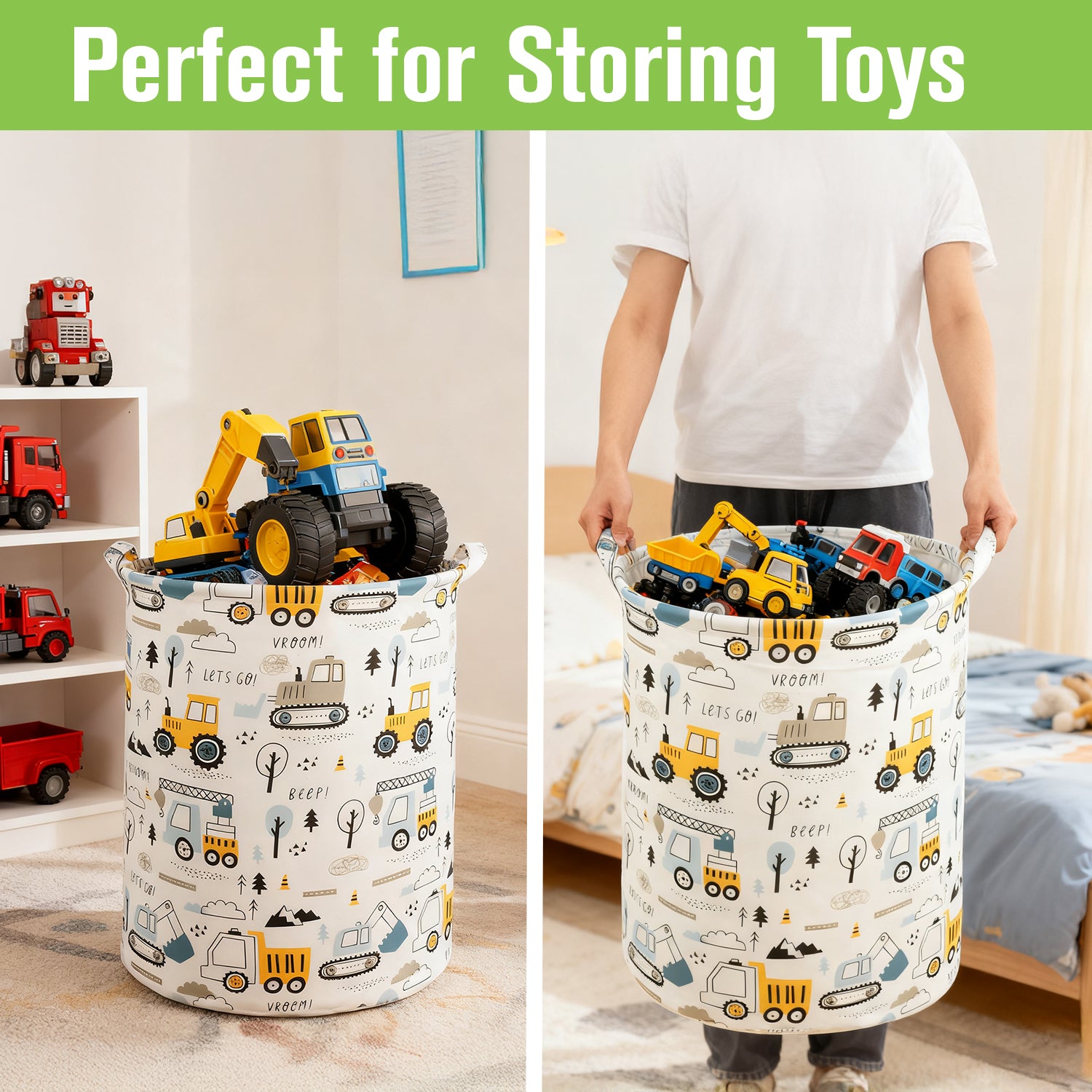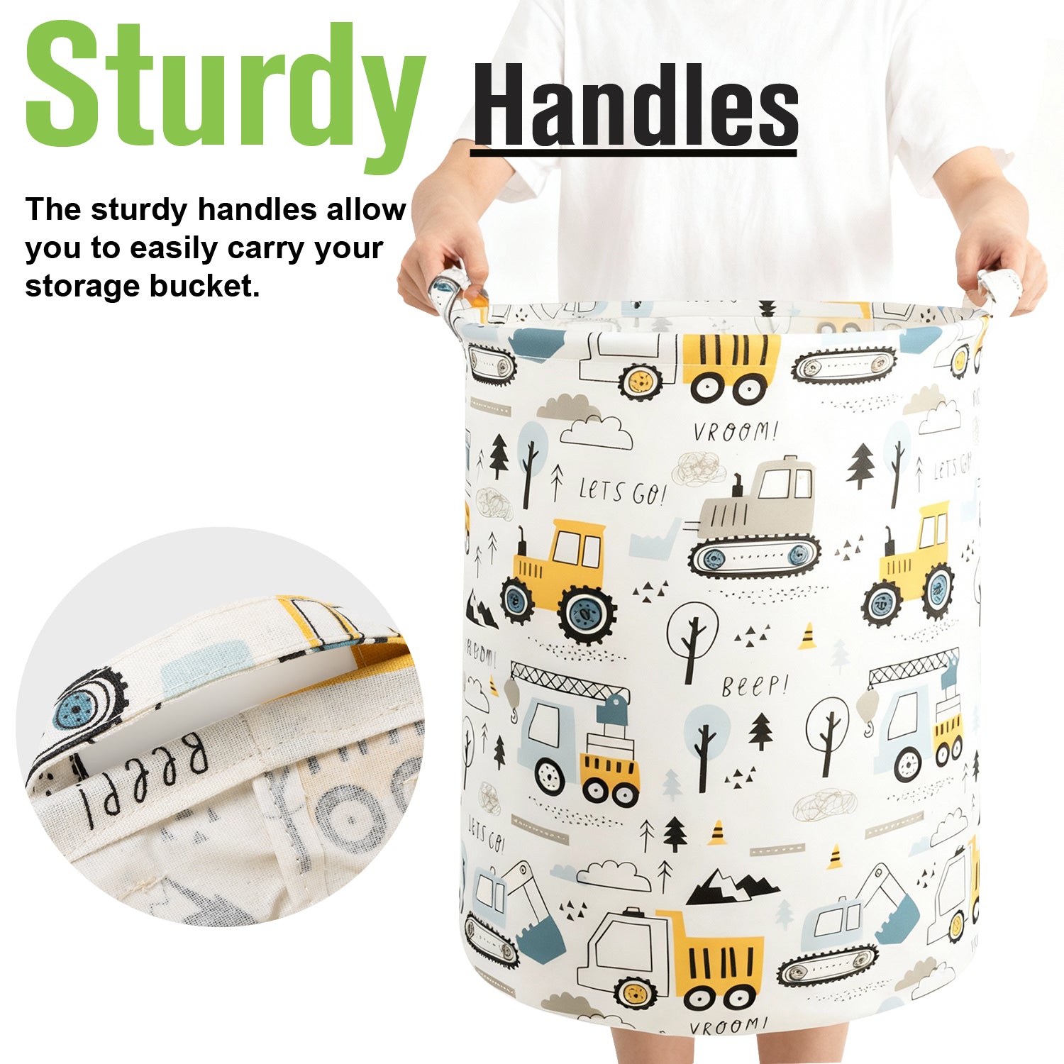 Made with playful blue, yellow, and white construction truck graphics, Garnen’s storage bucket adds a fun, engaging touch to any kids’ room while teaching them organization skills.