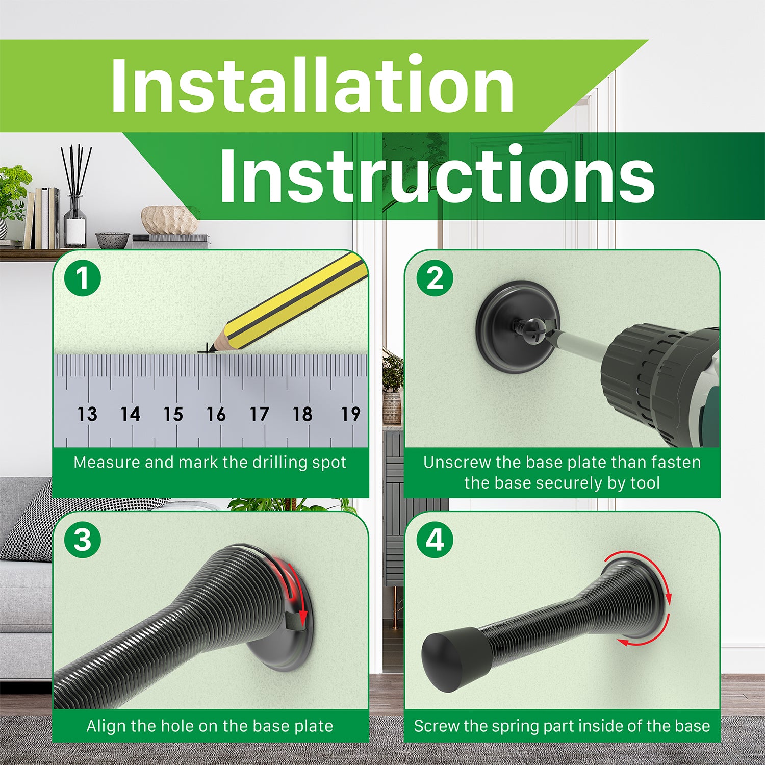 Install in two easy steps. Use the included screw to attach the baseplate to the desired location on your wall, then simply thread the stopper into the baseplate.
