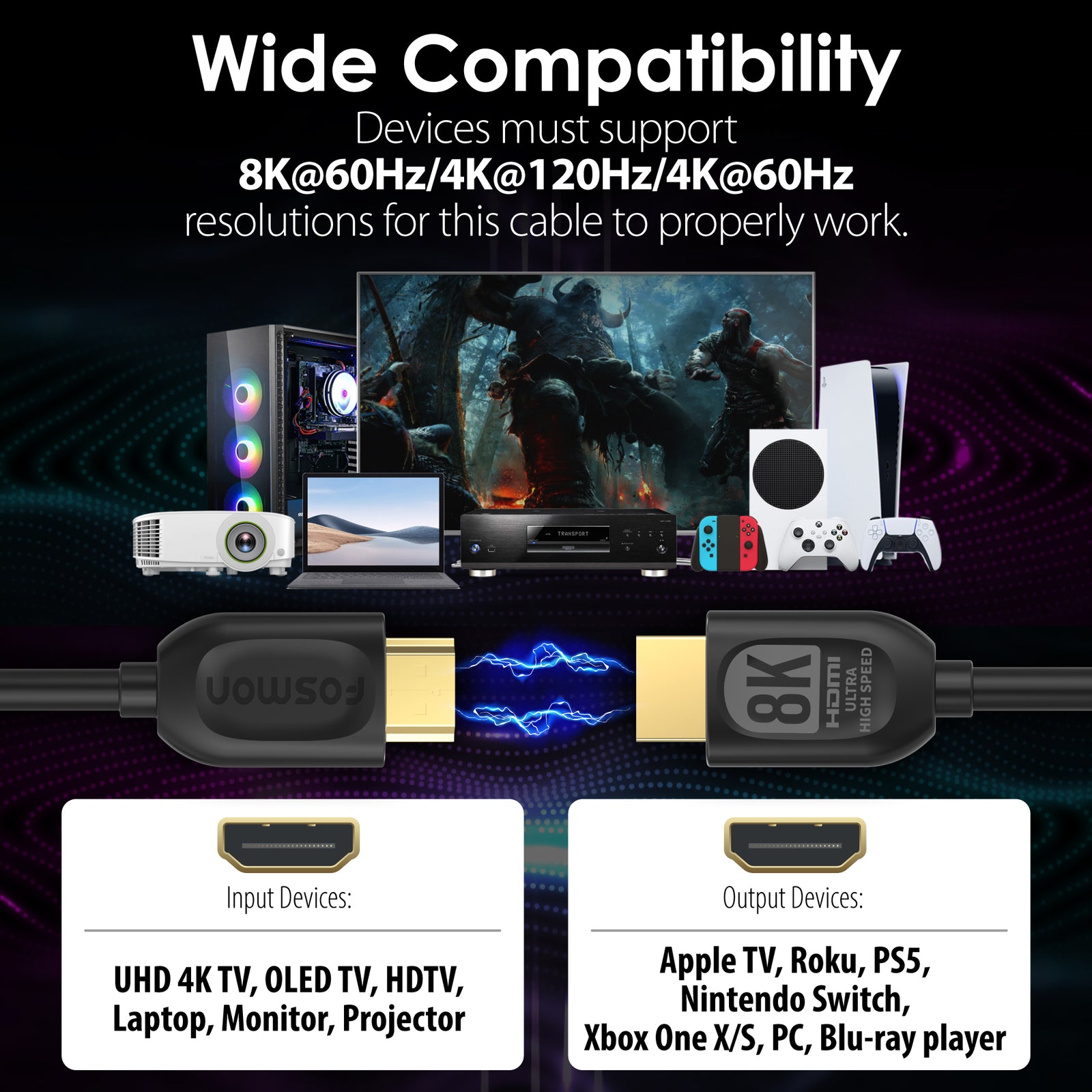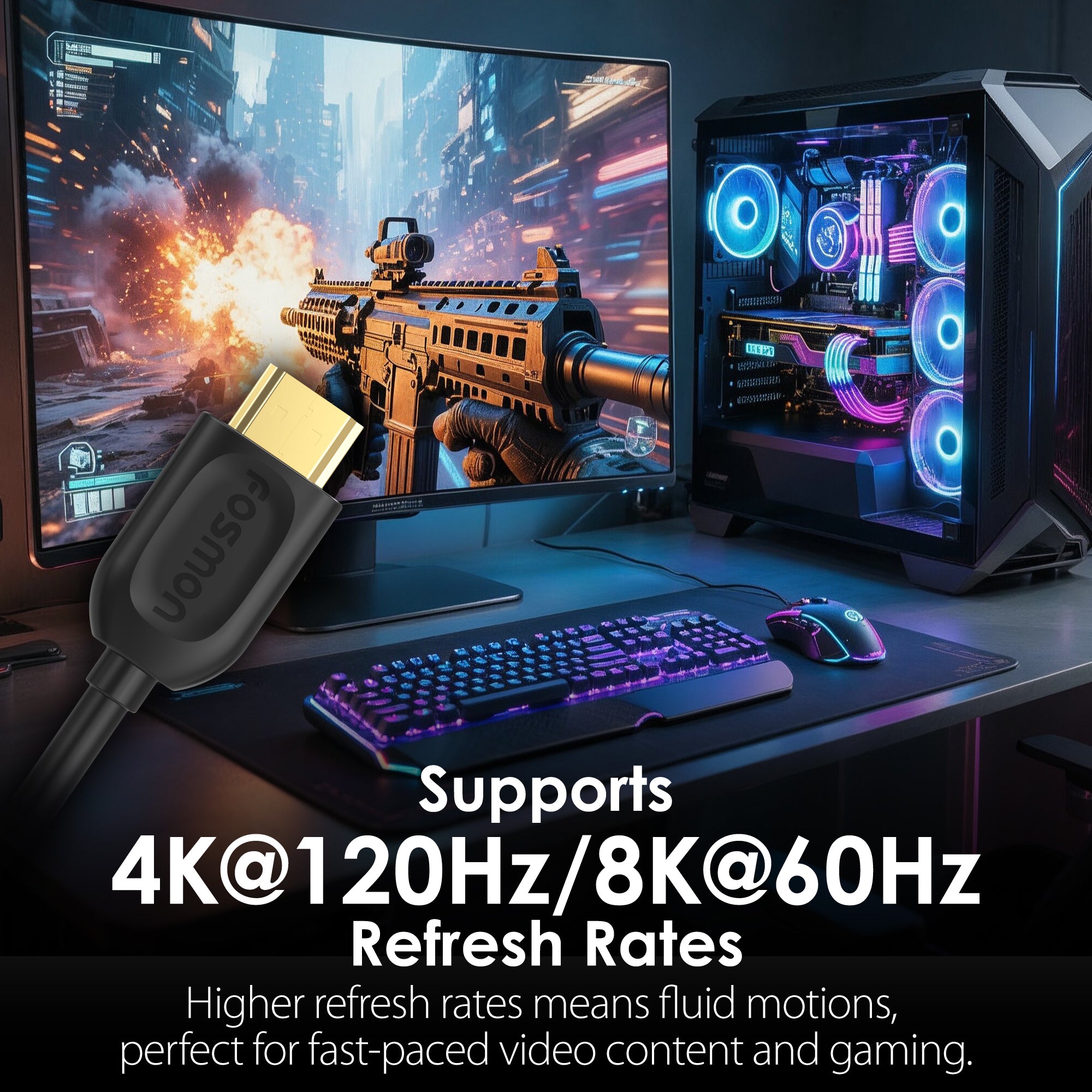 Fosmon’s HDMI cable works flawlessly with TVs, monitors, soundbars, projectors, and gaming consoles that support 8K@60Hz or 4K@120Hz. Its broad compatibility ensures you get exceptional performance across all your entertainment and professional devices.