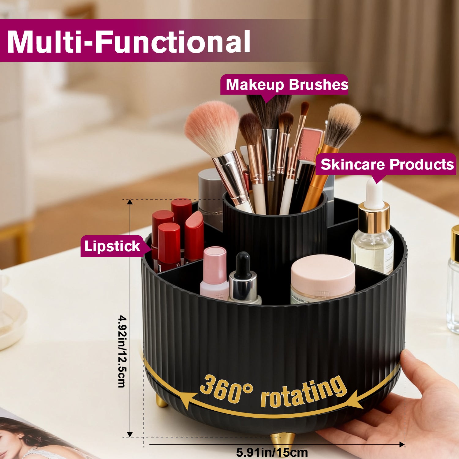 This makeup brush holder can rotate a full 360 degrees to provide easy access to all of its contents. It features an elegant and modern design that will complement any space in any application. Perfect for holding makeup, brushes, pens, markers, pencils, and more!