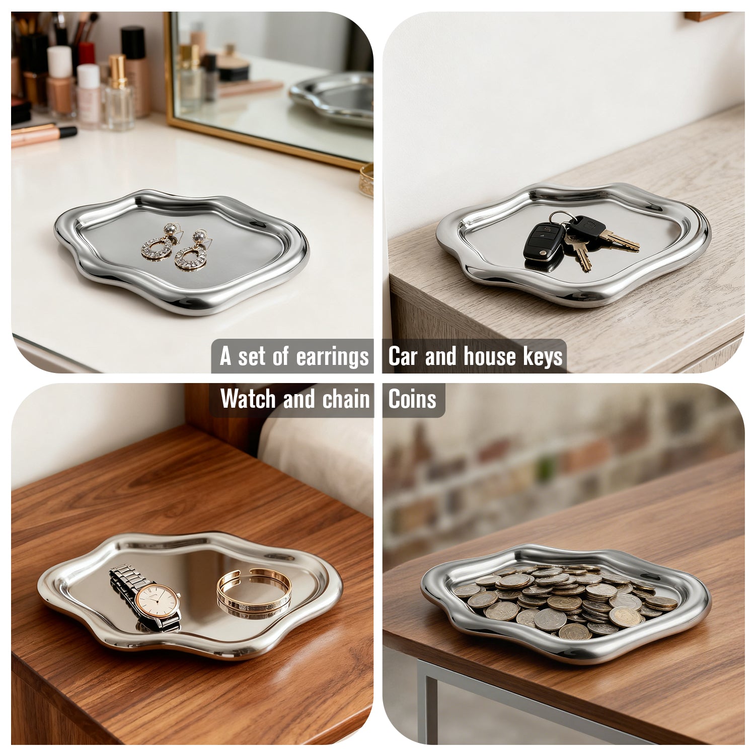 Chic Home Accent Use More than just a storage solution, this stainless steel tray acts as a stylish decorative piece that enhances the ambiance of your living space. Its timeless white color and smooth, natural form make it a versatile accent that complements a wide range of interior designs, from modern minimalist to cozy traditional. It's designed to elevate your home's aesthetic while serving a practical purpose.
