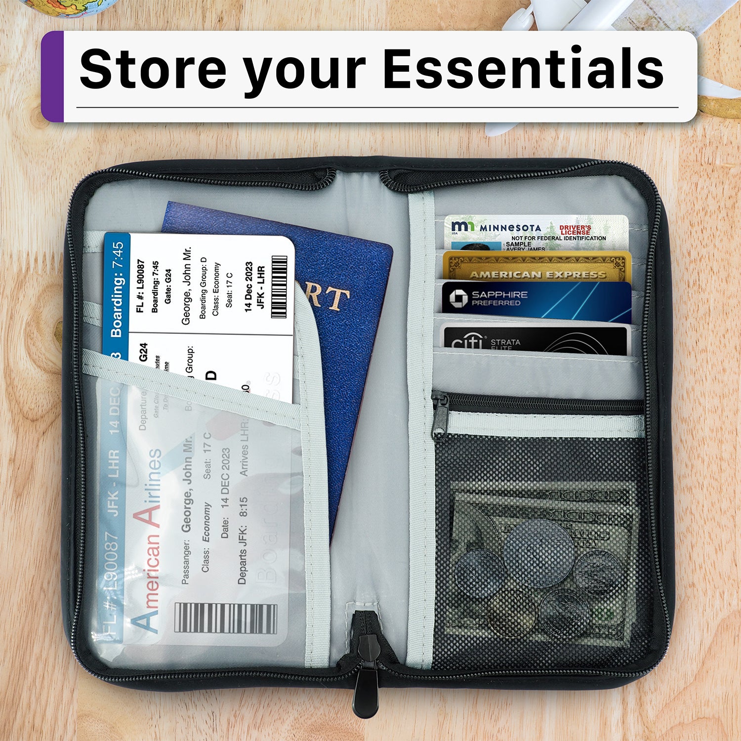Designed with multiple storage compartments to hold your passport, ID cards, credit cards, boarding passes, and cash. Making it easy to stay organized and stress-free on your journey.